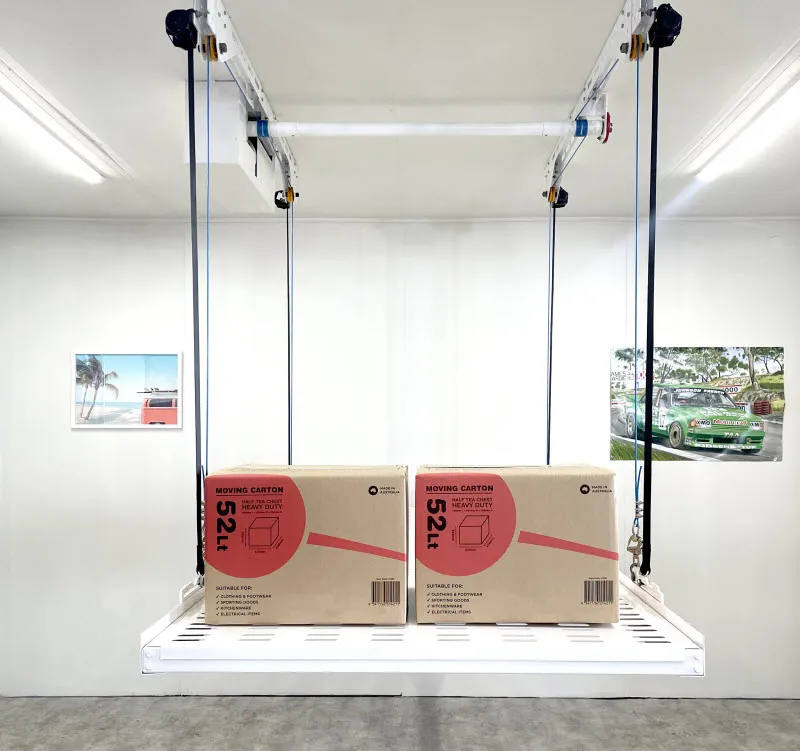 Reclaim your garage floor by maximising the overhead storage space without a ladder. The Ozil Lifts motorised garage storage lift can store boxes, kayaks, sporting and camping equipment, seasonal items or anything that takes up floor and wall space in your garage.