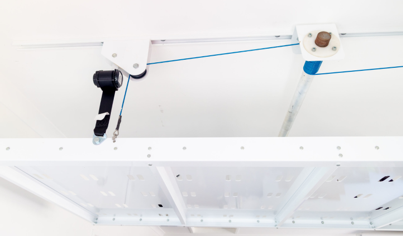 In the rare event of the wire rope suspension failing or becoming compromised, there is a safety strap at each corner of the load-carrying tray. They are connected to the ceiling support brackets, providing a secondary brake and hold capability. The safety belts will automatically engage to support the load, providing a double line of safety.